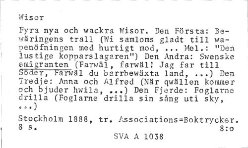 //// Wisor //// Fyra nya och wackra Wisor. Den Första: Sexåringens trall (Wi samloms gladt till wa-penöfningen med hurtigt mod, ... Mel.: "Den lustige kopparslagaren") Den Andra: Swenske emigranten (Farwäl, farwäl.' Jag far till Söder, Farwäl du barrbewäxta land, ...) Den Tredje: Anna och Alfred (När qwällen kommer och bjuder hwila, ...) Den Fjerde: Foglarne drilla (Foglarne drilla sin sång uti sky, * a • 3 //// Stockholm 1888, tr. Associations=Boktrycker. 8 s. 8: o //// SVA A 10 38 ////