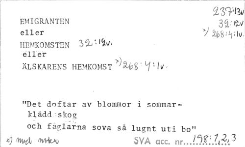 //// EMIGRANTEN //// eller V //// HEMKOMSTEN eller //// ÄLSKARENS HEMKOMST ' ^ IM ¦ //// "Det doftar av blommor i sommar-Vi ädd skog //// och fåglarna sova så lugnt uti bo" //// <m4ia> SVA cscc. nr.AtiVj.Äf? ////