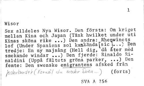 //// 1 //// Wisor //// Sex alldeles Nya Wisor. Den första: Om kriget mellan Kina och Japan (Tänk hwilket under uti Kinas sköna rike ...) Den andra: Rhenwinets lof (Under Spaniens sol kanhända [sic J.«,.) Den tredje: En ny majsång (Hell dig, då åter med smekande windar ..») Den fjerde: Rinaldo Ri-naldini (Uppå fältets gröna parker, ...) Den femte: Den swenske emigrantens afsked från //// | joskv-b^ätSr(Tatr^jaI c/u niookr (forts) //// SVA. A 256 ////