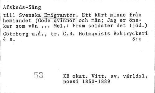 //// Afskeds-Sång //// till Svenska Emigranter. Ett kärt minne från hemlandet (Gode qvinnor och män; Jag er önskar som vän ... Mel.: Fram soldater det ljöd.) //// Göteborg u.å., tr. C.R. Holmqvists Boktryckeri 4 s. 8:0 //// 53 KB okat. Vitt. sv. världsl. poesi 1850-1889 ////