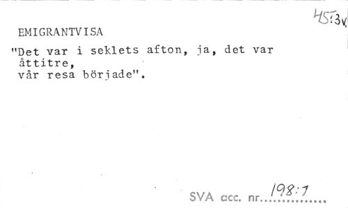 //// HSt: //// EMIGRANTVISA //// "Det var i seklets afton, ja, det var åttitre, //// vår resa började". //// SVA ccc. nr ////