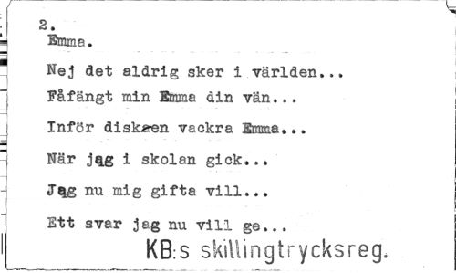 //// 2. //// ¦] Emma. //// Nej det aldrig sker i världen... Fåfängt min Emma din vän... //// Inför diskaren vackra Emma... //// Här jqg i skolan gick... //// -j //// Jqg nu mig gifta vill... //// J .¦'"' //// J Ett svar jag nu vill ge... //// I KB:S skillingtrycksreg. ////
