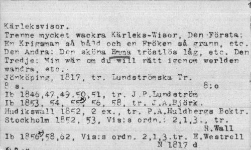 //// Kärleksvisor. //// Tre^ne mycket wackra Kärleks-^isor, Den-Första: //// Krigsman sA och er Fröke" så "-ra^-n, etc. //// De^ Ändra: Der skö^a Bmma tröstlös låg, etc. Den Tredje: '"'in wäi-> om du" W'il.1 rätt werlden //// wand ra, etc. • //// Jönköping, 1817, tr. Lundströmska Tr. //// P 3. 8;o //// Ib 1846,4-7,49. tr. J , ? . Lu^d at rön //// Ib 18^3, eb, «?8, tr. J.A.Björk. //// Hud i k swal 1 18^2, 2 ex., tr. P.A.Huldbercrs Boktr. //// Stockholm 18*2, 53, Vis:3 ordn.t 2,1,3., tr. //// H Wall //// Ib l?«r$«j8,62, Vi s; 3 ordn. 2,l,3.tr. E.Westrell //// N 1817 d ////