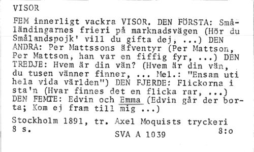 //// VISOR //// FEM innerligt vackra VISOR. DEN FÖRSTA: Små-ländingarnes frieri på marknadsvägen (Hör du Smålandspojk' vill du gifta dej, ...) DEN ANDRA: Per Mattssons äfventyr (Per Mattson, Per Mattson, han var en fiffig fyr, ...) DEN TREDJE: Hvem är din vän? (Hvem är din vän, du tusen vänner finner, ... Mel.: "Ensam uti hela vida världen") DEN FJERDE: Flickorna i sta'n (Hvar finnes det en flicka rar, ...) DEN FEMTE: Edvin och Emma (Edvin går der borta; Kom ej fram till mig"...) //// Stockholm 1891, tr. Axel Moquists tryckeri //// 8 S* SVA A 1039 8:0 ////