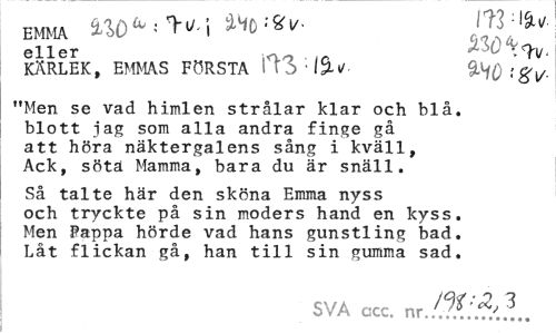 //// EMMA MO*.**! //// eller - ^->0 ^, //// KÄRLEK, EMMAS FÖRSTA ffö : ISU- QiO ' % v- //// "Men se vad himlen strålar klar och blå. blott jag som alla andra finge gå att höra näktergalens sång i kväll, Ack, söta Mamma, bara du är snäll. //// Så talte här den sköna Emma nyss och tryckte på sin moders hand en kyss. Men Pappa hörde vad hans gunstling bad. Låt flickan gå, han till sin gumma sad. //// SVA gcc. nr ////