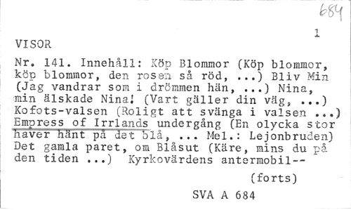 //// frö»! //// 1 JU //// VISOR //// Nr, 141. Innehåll: Köp Blommor (Köp blommor, köp blommor, den rosen. så röd, ...) Bliv Min (Jag vandrar som i drömmen hän, ...) Nina, min älskade Nina! (Vart gäller din väg, ...) Kofots-valsen (Roligt att svänga i valsen ...) Empress of Irrlands undergång (En olycka stor haver hänt på det blå, ... Mel.: Lejonbruden) Det gamla paret, om Blåsut (Käre, mins du på den tiden ...) Kyrkovärdens antermobil-- //// (forts) //// SVA A 684 ////