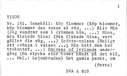 //// 1 //// VISOR //// Nr. 141. Innehåll: Köp Blommor (Köp blommor, köp blommor den rosen så röd, ...), Bliv Min (Jag vandrar som i drömmen hän, ...) Nina, min älskade Ninal (Min älskade Nina, vart gäller din väg, ...) Kofots-valsen (Roligt att svänga i valsen ...j Min hatt den har trekanter, ...) Empress of Irrlands undergång (En olycka stor haver händt på det blå, ... Mel.: Lejonbruden) Det gamla paret, om //// (forts) //// SVA A 6 76 ////