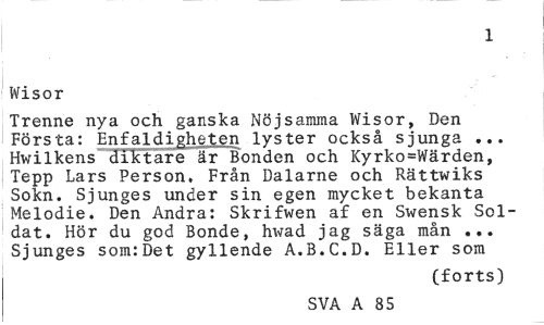 //// 1 //// Wisor //// Trenne nya och ganska Nöjsamma Wisor, Den Första: Enfaldigheten lyster också sjunga ... Hwilkens diktare är Bonden och Kyrko=Wärden, Tepp Lars Person, Från Dalarne och Rättwiks Sokn. Sjunges under sin egen mycket bekanta Melodie. Den Andra: Skrifwen af en Swensk Soldat. Hör du god Bonde, hwad jag säga mån ... Sjunges som:Det gyllende A.B.C.D. Eller som //// (forts) //// SVA A 85 ////