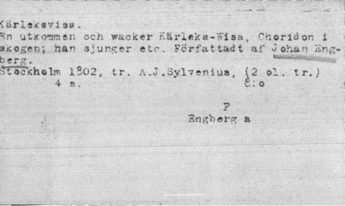 //// ;äri3<8vi 3». //// Sn utKO-nmen och vacker Kärlek a-Wtsa, Choridor. i »(cogen; han sjunger etc. Författadt af ö ohan -•gr,?. //// JTSckholm lS02. tr. A.J.Sylveniua, (2 ol. tr.) //// 4 s. t: o //// ¦ ? //// Engberpj a ////