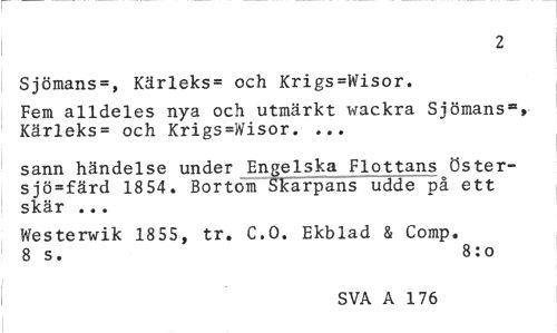 //// 2 //// Sjömans=, Kärleks= och Krigs=Wisor. //// Fem alldeles nya och utmärkt wackra Sjömans», Kärleks= och Krigs=Wisor. ... //// sann händelse under Engelska Flottans öster-sjö=färd 1854. Bortom Skarpans udde på ett sksr ••• //// Westerwik 1855, tr. C.O. Ekblad & Comp. 8 s. 8:o //// SVA A 176 ////