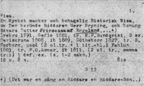 //// 5 ^ -' ' -'. • " : '.-C"-" i* . //// ^isa. //// |n Mycket vacker och behagelig Historisk Wisa, era Den berömde Riddaren Herr Eryning, och Konung Sd vars dotter Prinsessaaf Eng el and ,... + ) jrebro 1791, &efl« 1801, tTTTT^Sundqvist, 2 ex. :*rls.<rona 1808, ib 1809, Sötheborr 1827, tr. 3. ?orber*j, uooå (2 ol.tr. + 1.'tit'.-bl,) Fahlun 1803 tr. P.O.Åxmar, ib l8ll, (2 ol. tr., samma tr;i) 1 def, ex. (s. 1-2 sak",) 16 o. 8 s. 8;o //// . ¦ v„, 1 ' ¦ , : ¦ ' ' ; K //// ?) (Det w&r en gång en Riddare en Hiddare-Scn..) ////