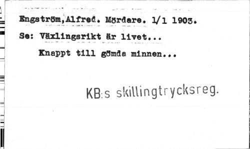 //// J Engström,ÅlfreÄ. Mördare, l/l 1903* //// - Se: Växlingsrikt är livet... //// . - - - ^ -¦ -. ¦ //// Knappt till gömåa minnen... //// 1 //// 1 KB.s skiUingtrycksreg. //// i ////