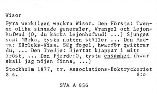 //// Wisor //// Fyra werkligen wackra Wisor. Den Första: Twen-ne olika sinnade generaler, Wrangel och Lejon-bufwud (0, du käcka Le jonhufwud.' ...) Sjunges scm: Mörka, tysta natten ställer ... Den Andra: Kärleks-Wisa. Säg fogel, hwarför qwittrar du, ... Den Tredje: Hjertat klappar i mitt bröst, ... Den Fjerde:0, tysta ensamhet fhwar skall jag nöjen finna, ...) //// Stockholm 1877, tr, Associations-Boktryckeriet 8 s. 8:o //// SVA A 956 3 ////