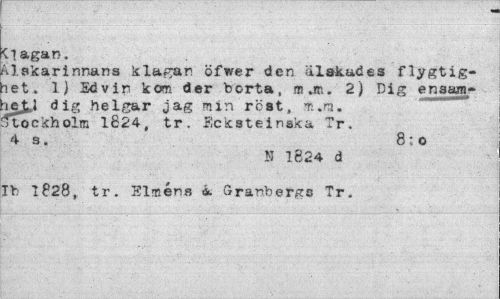 //// CTagan. //// älskarinnans klagar öfwer den älskades flygtig-let. 1) Edvin kom der borta, m.m. 2) Dig ensara-lejt» dig helgar jag min rest, m.ra. Stockholm 1824, tr. Ecksteinska Tr, 4 s. 8;o //// N 1824 d //// rb 1828, tr. Elméns & Granbergs Tr. ////