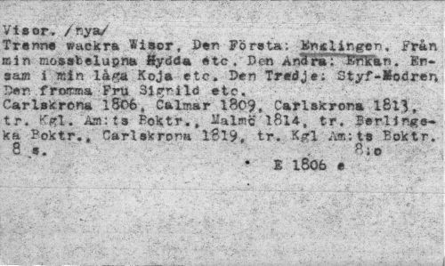 //// Vi 8 or. / nya/ //// Trenrve wackra Wisor, Der» Första: Enslingen. från min mossbelupna Hydda étc . Ben An<iNi: ätskäb. Ensam i min låga Koja etc. Den Tredje; Styf-Modren Der. fromma Frta 3igr-ild etc. //// Carlskrona l5o6, Calmar 1809, Cariskrena 1813, tr. 'A»:ts Foktr., Malmc 1-814, tr. Berlinge- //// ka Eoktr., Carlskröna lSl9, tr. Kgl A»;t* Boktr. 8 s. . //// • E 1806 e //// m, > ; ; , v ° - \ 1 „ ////