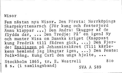 //// Wisor //// Fem nästan nya Wisor. Den Första: Norrköpings Skarpskyttemarsch (För kung och fosterjord Ännu klappar ...) Den Andra: Skuggor af de flydda dar, ... Den Tredje: På" en igen! Ny och munter Wisa om Danska kriget (Knappast kung Fredrik till fädren gick, ...) Den Fjerde: §aslia££JGL på Johannisskäret (Till kärlekens hemland jag längtar igen, ...) Den Femte: Folk=Sång. Kung Carl den unga hjelte, ... //// Stockholm 1865, tr. E. Westrell 8:0 //// 8 s. (i samlingsband) SVA A 5gg ////