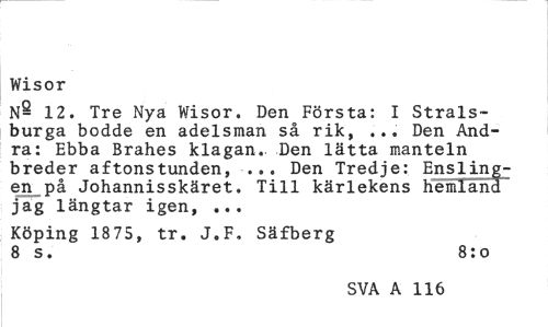 //// Wisor //// 12. Tre Nya Wisor. Den Första: I Strals-burga bodde en adelsman så rik, ... Den Andra: Ebba Brahes klagan. Den lätta manteln breder aftonstunden, ... Den Tredje: Enslingen på Johannisskäret. Till kärlekens hemland" jag längtar igen, ... //// Köping 1875, tr. J.F, Säfberg 8 s. 8:o //// SVA A 116 ////