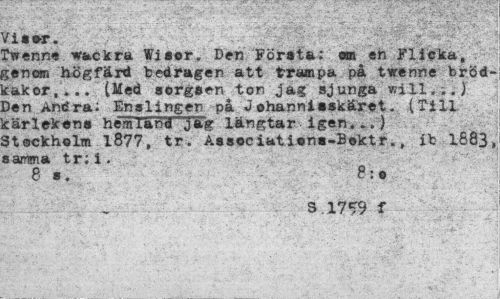 //// • ' ¦ »' ¦ . .. ¦¦«¦ • ¦ ¦ l .. ."-J - //// / i s er. //// Cwenne wackra Wisor. Den Förata: an en Flicka, . jenom högfärd bedragen att trampa på twenne fcröd-cakor, ... (Med sorgsen tor. Jag sjunga will.,.) Den Andra: Enalingen på Johanni»skäret. (Till cärlekens hem rand jag längtar igen.) 3t©ckholm 1877, tr. Associatiens-Boktr., ib 1883, sarrsna tr; i. 8 •. //// , . . . 3.1759 f ////