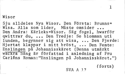 //// 1 //// Wisor //// Sju alldeles Nya Wisor. Den Första: Brunns= Wisa. Alla som lider, Måste omsider ... Den Andra: Kärleks=Wisor. Säg fogel, hwarför qwittrar du, ... Den Tredje: Se blomman uti lunden, begynner sig att wisa, ... Den Fjerde: Hjertat klappar i mitt bröst, ... Den Femte: Enslingen på Johannisskäret (Denna utmärkt wacTcrä Säng är författad i anledning af Fru Carléns Roman:"Enslingen på Johannisskäret.") //// (forts) //// SVA A 2 75 ////