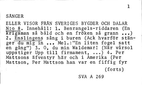 //// 1 //// SÅNGER //// ELLER VISOR FRÄN SVERIGES BYGDER OCH DALAR N:o 8. Innehåll: 1. Benrangels-riddaren (En krigsman så båld och en fröken så grann ...) 2. Enslingens sång i buren (Ack hvarför stänger du mig in ... Mel.:"En liten fogel satt en gång") 3. 0, du min Waldemar I (När vårsol uppstiger Upp till firmament, ...) 4. Per Mattsons äfventyr här och i Amerika (Per Mattson, Per Mattson han var en fiffig fyr //// (forts) //// SVA A 269 ////