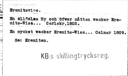 //// y Eremitsvi«?a. //// ¦ En alldeles Ny och öfwer måttan wacker Ere- //// ^ mits-Wisa... Carlskr.1802, //// = En mycket wacker Eremits-Wisa... Calmar 1809. //// | Se: Eremiten. //// ¦ //// j KB.s skillingtrycksreg. ////