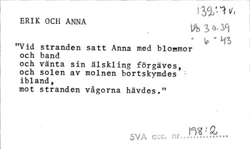 //// ERIK OCH ANNA //// ' " Hh //// "Vid stranden satt Anna med blommor och band //// och vänta sin älskling förgäves, och solen av molnen bortskymdes ibland, //// mot stranden vågorna hävdes." //// m! Qj //// SVA ccc. nr.../... ////