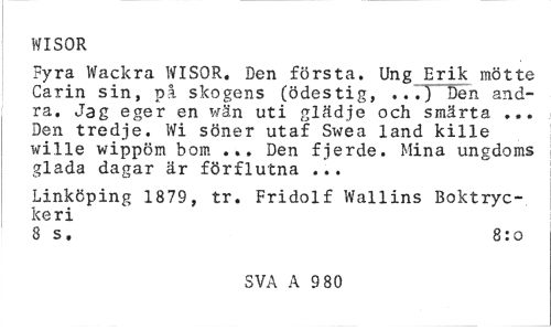 //// WISOR //// Fyra Wackra WISOR. Den första. Ung Erik mötte Carin sin, på skogens (ödestig, ...) Den andra. Jag eger en wän uti glädje och smärta ... Den tredje. Wi söner utaf Swea land kille wille wippöm bom ... Den fjerde. Mina ungdoms glada dagar är förflutna ... //// Linköping 1879, tr. Fridolf Wallins Boktryckeri //// 8 s. 8:0 //// SVA A 9 80 ////