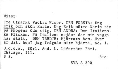 //// Wisor //// Tre Utmärkt Vackra Wisor. DEN FÖRSTA: Ung Erik och skön Karin. Ung Erik mötte Karin sin på skogens öde stig, DEN ANDRA: Den Italienska Flickan. På Italiens nejder der min vagga har stått, DEN TREDJE: Hjärtats hem. Hvar är ditt hem? jag frågade mitt hjärta, No. 1. //// U.o.o.å., förl. And. L. Löfströms Förl. Chicago, 111. //// 8 s. 8:0 //// SVA A 200 ////