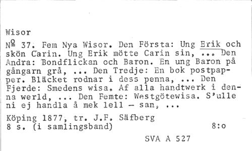 //// Wisor //// N- 37. Fem Nya Wisor. Den Första: Ung Erik och skön Carin. Ung Erik mötte Carin sin, Den Andra: Bondflickan och Baron. En ung Baron på gångarn grå, ... Den Tredje: En bok postpapper. Bläcket rodnar i dess penna, ... Den Fjerde: Smedens wisa» Af alla handtwerk i denna werld, ... Den Femte: Westgötewisa. Skulle ni ej handla å mek lell - san, ... //// Köping 1877, tr. J.F, Säfberg 8 s. (i samlingsband) 8:o //// SVA A 5 27 ////