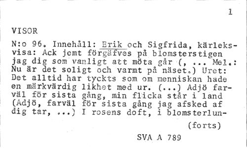 //// 1 //// VISOR //// N:o 96» Innehåll: Erik och Sigfrida, kärleksvisa: Ack jemt förgäfves på bloms te rs ti gen jag dig som vanligt att möta går C, Mel,: Nu är det soligt och varmt på näseto) Uret: Det alltid har tyckts som om menniskan hade en märkvärdig likhet med ur. (...) Adjö farväl för sista gång, min flicka står i land (Adjö, farväl för sista gång jag afsked af dig tar, ...) I rosens doft, i bloms terlun- //// (forts) //// SVA A 789 ////