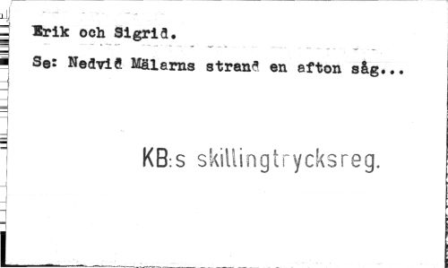 //// i //// ; Erik och Sigria. //// ¦ Se: Nedvlt Mälerns strand en afton såg... //// i //// 1 j //// KB:S skillingtrycksreg. //// i //// j ] //// i ////