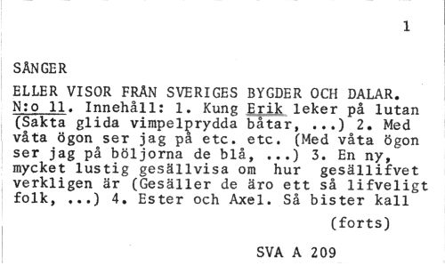 //// 2 //// SÅNGER //// ELLER VISOR FRÄN SVERIGES BYGDER OCH DALAR. N:o 11. Innehåll: 1. Kung Erik leker på lutan (Sakta glida vimpeljDrydda båtar, ...) 2. Med våta ögon ser jag pa etc. etc. (Med våta ögon ser jag på böljorna de blå, ...) 3. En ny, mycket lustig gesällvisa om hur gesällifvet verkligen är (Gesäller de äro ett så lifveligt folk, ...) 4. Ester och Axel. Så bister kall //// (forts) SVA A 209 ////