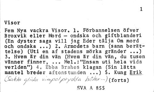 //// 1 //// Visor //// Fem Nya vackra Visor. 1. Förbannelsen öfver Broxvik eller Mord - ondska och giftblanderi (En dyster saga vill jag Eder tälja Om mord och ondska ...) 2. Armodets barn (sann berättelse) (Uti en af stadens mörka gränder ...) 3, Hvem är din vän (Hvem är din vän, du tusen vänner finner, ... Mel.;"Ensam uti hela vida verlden") 4, Ebba Brahes klagan (Sin lätta mantel breder aftonstunden ,..) 5. Kung Erik //// y/,'Ja vtoh^c/^yc/c/a (forts) //// SVA A. 855 ////
