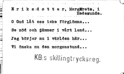 //// : Erik s d o t t e r, MergKreta, i //// = Hedeaunda. //// ¦ ¦ - - - - - -».•¦- -¦ -...- //// 0 Gud låt oss leke förglömma... Se nöd och jämmer i vårt land... I Jag "börjar nu i världen här... Vi önska nu den morgonstund... //// : KB:S skillingtrycksreg. ////
