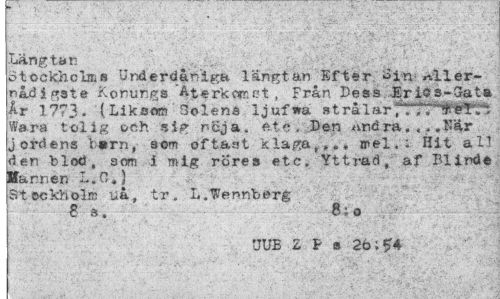 //// Längtan //// Stockholms Underdåniga längtan Efter: ^in ^ller-nådigste Konungs "Aterkemot, Från Dess Erios-Gata År 1773- i Liksom Solens ljufwa »trålarfSwW^ Wara tolig och -i i g nöja. etc . Den And ra, .., Kär jordens barn, som oft&at klaga,»., mel.; Hit all den blod, som i mig röres etc. Yttrad, af Blinde Hannen 1.0.) //// Stockholm uå, tr. L.Wennberg //// B s. 8,0 //// UUB 4 P s ////