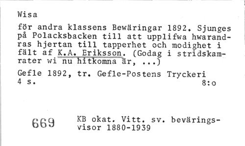 //// Wisa //// för andra klassens Bewäringar 1892, Sjunges på Polacksbacken till att upplifwa hwarand-ras hjertan till tapperhet och modighet i fält af K.A. Eriksson. (Godag i stridskamrater wi nu hitkomna är, . //// Gefle 1892, tr. Gefle-Postens Tryckeri 4 s. 8: o //// nnq KB okat. Vitt. sv. bevärings-O"3 visor 1880-1939 ////
