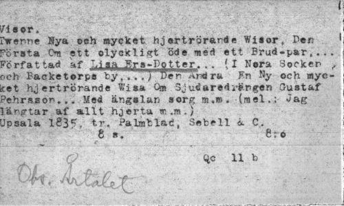 //// risor. //// 'tenrie Bya ©eh mycket hjertrörartde Wisor» Den 1 *örsta Om ett olyckligt öde *ned ett Brud-par,... ?örfattad af LlaiiJ?rs«-Dotter. . . (I Nora Socker ,, rch Bac ke t © r p« by, . ..J "Den"and ra En Ny och myc-tet hjertrörande Wisa O» Sjuéaredrfcngen Gustaf ?ehrsson... Med ängslar; s org m.» . (mel.: Jag l ängtar af allt hjerta « .«.) Jpsala 1835, tr. Palmblad, Sebell & C. //// g s. 8:o //// O ^ 11 b //// VjJyt Ms Iri f/ ¦ • . . .' --v- ////