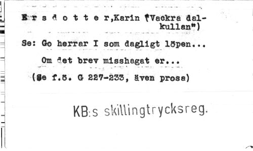 //// It s d o t t e r,Karin t'Vackra dal-j kullan*) //// = Se: Go herrar I som dagligt löpen... //// = Om det brev misshagat er... //// | (Se f.Ö. G 227-233, även prosa) //// ! KB:S skiilingtrycksreg. ////