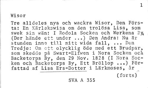 //// Wisor //// Tre alldeles nya och wackra Wisor, Den Första: En Kärlekswisa om den trolösa Lisa, som swek sin wän: I Rodola Socken och Werkena Eft (Der hände ett under ,,.) Den Andra: Nu är stunden inne till mitt wida fall, ... Den Tredje: Om ett olycklig öde ned ett Brudpar» som skedde på Swart=Elfwen i Nora Socken ocli Backetorps By, den 29 Nov. 182 8 (I Nora Socken och Backetorps By, Ett Bröllop ...) Författad af Lisa Ers=Dotter i Lärkmoses, år //// (forts) //// SVA A 355 ////