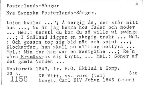 //// Fosterlands=Sånger J //// Nya Swenska Fosterlands=Sånger. //// Lejon hwilar ..."; Å bergig ås, der står mitt hus ...; Nu är jag hemma hos fader och moder i ... Mel.: Kersti du kom du så wille v/i swänga ...; I Småland ligger en skogig trakt ... Mel. : Och gossen tog sig båd nät och spjut Klockarfar, han skall nu allting bestyra ... Mel.: Min far han v/ar en Westgöthe ...; Re"n wåra Ersmäss=ax sig knyta, ... Mel.: Söner af det gamla Norden ... //// Westerwik 1843, tr. E.O. Ekblad & Comp. //// 20i|,rn KB Vitt. sv. vers (tal) 8:0 //// JLlOb kungl» Carl XIV Johan 1843 (anon) ////