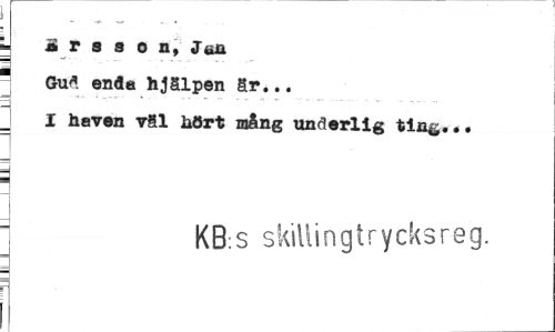 //// '» H r 3 s o n, Jan //// Gu»1» enda hjälpen är... I haven väl hört m&ng underlig tin&... //// KB:S skillingtrycksreg. //// i ////