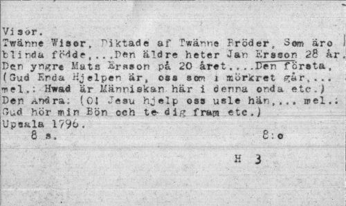 //// Visor. //// Twänne Wisor, riktade af Twänne Bröder, Som aro blinda födde,,..Pen äldre heter Jan Ersson 28 ar Den yngre Mats Ersson på 20 året...Den första, (Gud Enda Hjelpen är, oss som i mörkret går,... Tel.: Hwad är Människan här i denna onda etc.^ Den Andra. (01 Jesu hjelp oss usle hän,... n>el,. Gud hör min Bön och te dig fra«t etc.) Upsala 1796. //// 8 s. £ : o //// H 3 ////