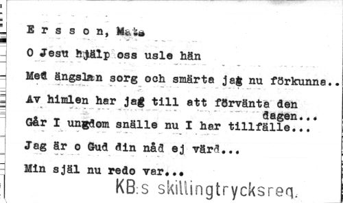 //// !j E r s s o n, Hata //// O Jesu h$älp oss usle hän //// - Me« ängslan sorg och smärta jag nu förkunna.. //// | Av himlen har jag till att förvänta den //// dagen..• //// Går I ungdom snälle nu I har tillfälle... Jag är o Gud din nåa ej värd... = Min själ nu redo var... //// ' KB s skillingtrycksreq. ////