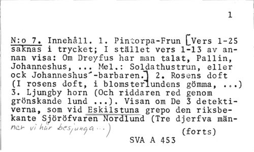 //// 1 //// N:o 7. Innehåll. 1. Pintorpa-Frun [Vers 1-25 saknas i trycket; I stället vers 1-13 av annan visa: Om Dreyfus har man talat, Pallin, Johanneshus, ... Mel.: Soldathustrun, eller ock Johanneshus''-barbaren.1 2. Rosens doft (I rosens doft, i blomsterlundens gömma, .<>.) 3. Ljungby horn (Och riddaren red genom grönskande lund ...). Visan om De 3 detektiverna, som vid Eskilstuna grepo den riksbekante Sjöröfvaren Nordlund (Tre djerfva män-nch vi kur ées^un^a ¦ ) (forts) //// SVA A 45 3 ////