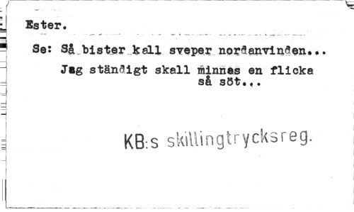 //// Ester. //// - Se: Så bister kall sveper noråanvinåen... //// J®g ständigt skall minnas en flicka = så söt.«. //// i KB:S skillingtrycksreg. ////
