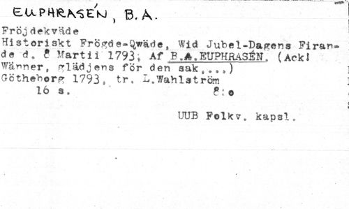 //// EUPHfe/VSEk) } B. k. //// Fr oj dekväde //// Historiskt FrÖ.?de-Qwäde s Wid Jubel-Dagens Firande d. ? Marti i 1793; Af B.A.EUPHRASÉN, (AckJ Wänner, glädjens för den sak»..») Göthebor* 1793, tr, L.Wahlström //// 16 a. o //// UUB Folkv. kapsl. ////