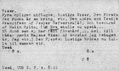 //// Visor, //// Pyra nyligen utflugne, lustige Wisor, Den Första Sex runda år oj® kring, etc. Den Andra och Tredje Vraaglfwen Af Jesper Nefwerträfå?-j Och besparad Af Malin Sylta, ( 'M Eva skulle nu upstå. EN Hund som ej har fVCC förstånd. cael, till "båda: gamla Maj sas Wisa: Af ängslan jag betagen, är. Jag fttc,} Den Fjei-ds; Lustiga Bröder nu lul-Xa til samman etc, Ueea //// 8 s. 8;o //// C 8 //// Uooå, UUB z. ?. s. 6:22 ////
