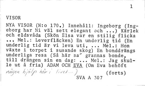 //// 1 //// VISOR //// NYA VISOR (N:o 170.) Innehåll: Ingeborg (Ingeborg har Ni väl sett elegant och ...) Kärlek och eldsvåda (Skön Elsa var en stilig flicka ... Mel.: Leverfläcken) En underlig tid (En underlig tid är vi leva uti, ... Mel.: Hon växte i torpet i susande skog) En bonddrängs underliga resa (Så här sa" grannas bonde, till drängen sin en dag: ... Mel.: Jag skulle ut å fria) ADAM OCH EVA (Om Eva behöft //// /la^tn hja/jo ha/- i /iye/.J (forts) //// SVA A 30 7 ////
