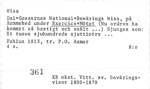 //// Wisa //// Dal=Gossarnas National=Bewärings Wisa, på Rommehed under Exercice=Mötet (Nu ordres ha kommit så hastigt och snält ,«.) Sjunges som; Et tusen sjuhundrade sjuttiotre //// Fahlun 1813, tr. P.O. Axmar 4 s. 8:0 //// 361 //// KB okat. Vitt. sv. bevärings- //// visor 1800-1879 ////