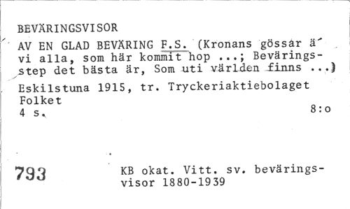 //// BEVÄRINGSVISOR //// AV EN GLAD BEVÄRING F.S. (Kronans gossar ä" vi alla, som här kommit hop Bevärings- //// step det bästa är, Som uti världen irinns ...) //// Eskilstuna 1915, tr. Tryckeriaktiebolaget Folket //// 4 s. 8:0 //// 79^ KB okat. Vitt. sv. bevärings- //// visor 1880-1939 ////